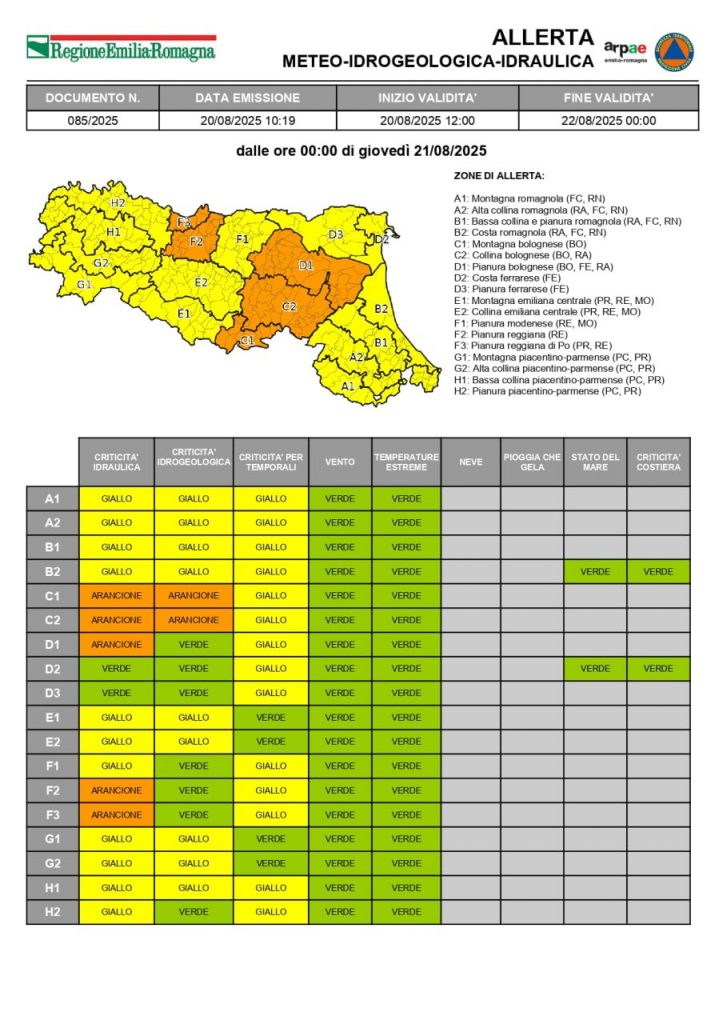 Dalle ore 12 di oggi, 20 agosto 2025, fino alle 00.00 del 22 agosto, è attiva un’allerta meteo arancione per criticità idraulica e gialla per temporali sulla Pianura Bolognese.